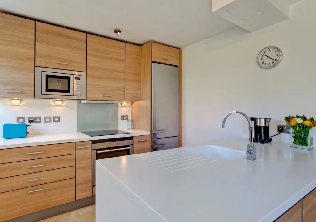 Fittings like cupboards and drawers are properly mounted, aligned, and level, with even gaps where needed for flooring.